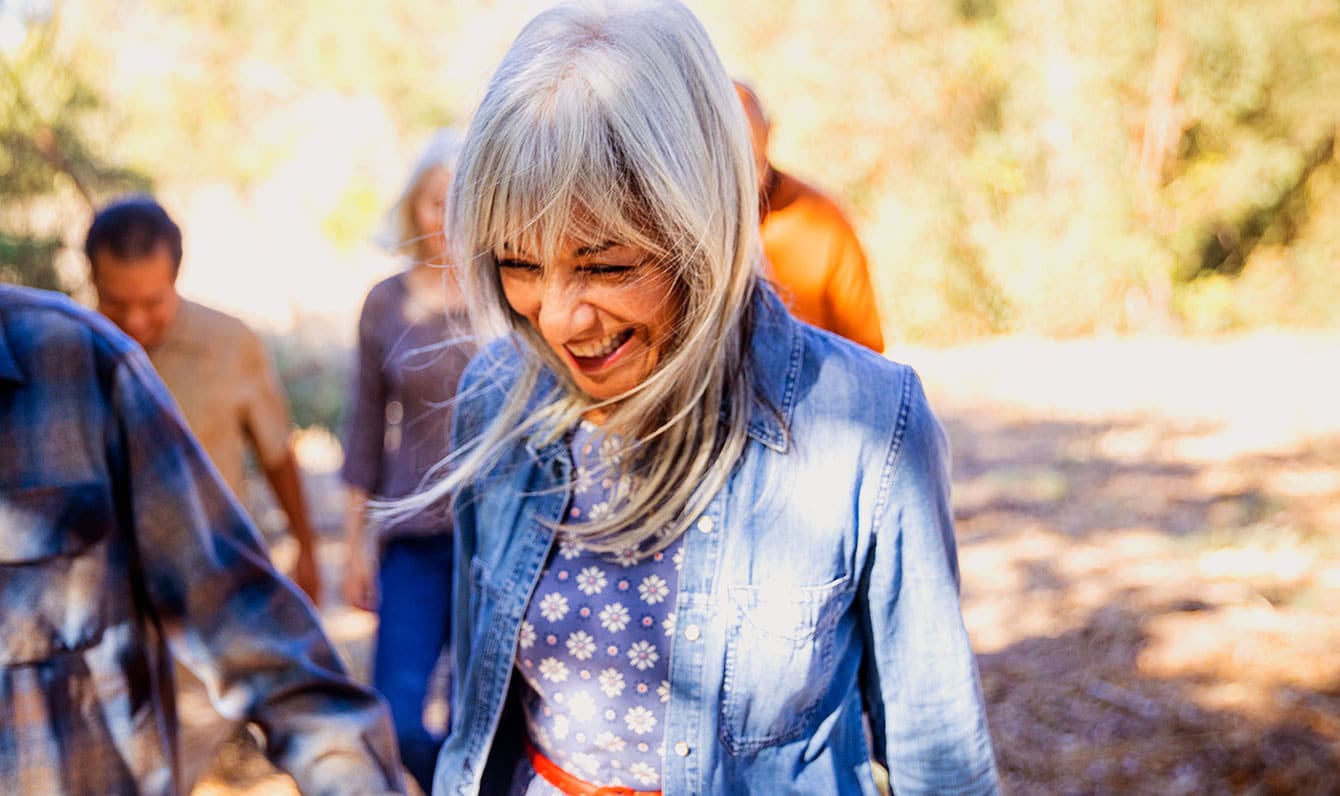 A retired woman smiling and walking through the woods with people.